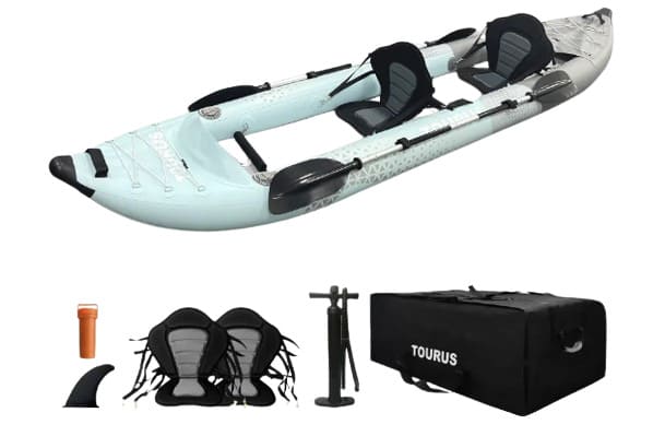 Kayak inflable para dos personas, incluye 2 remos y una quilla para una navegación sin esfuerzo. Comodidad y diversión garantizadas.