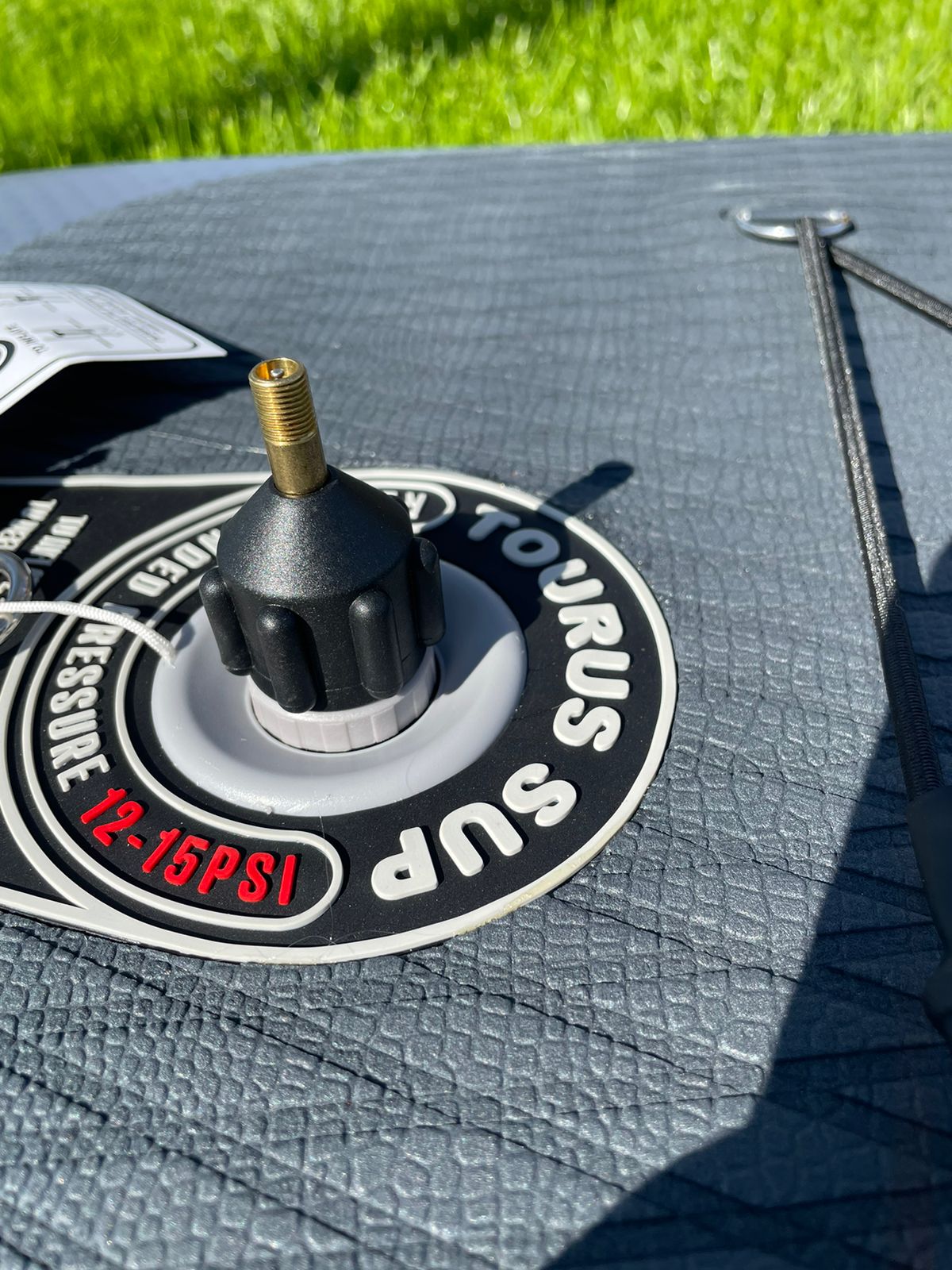 La válvula para SUP de marca Tourus  es una excelente alternativa para inflar tu SUP, es un accesorio que se conecta a los compresores para inflar de manera mas rápida y sin esfuerzo.