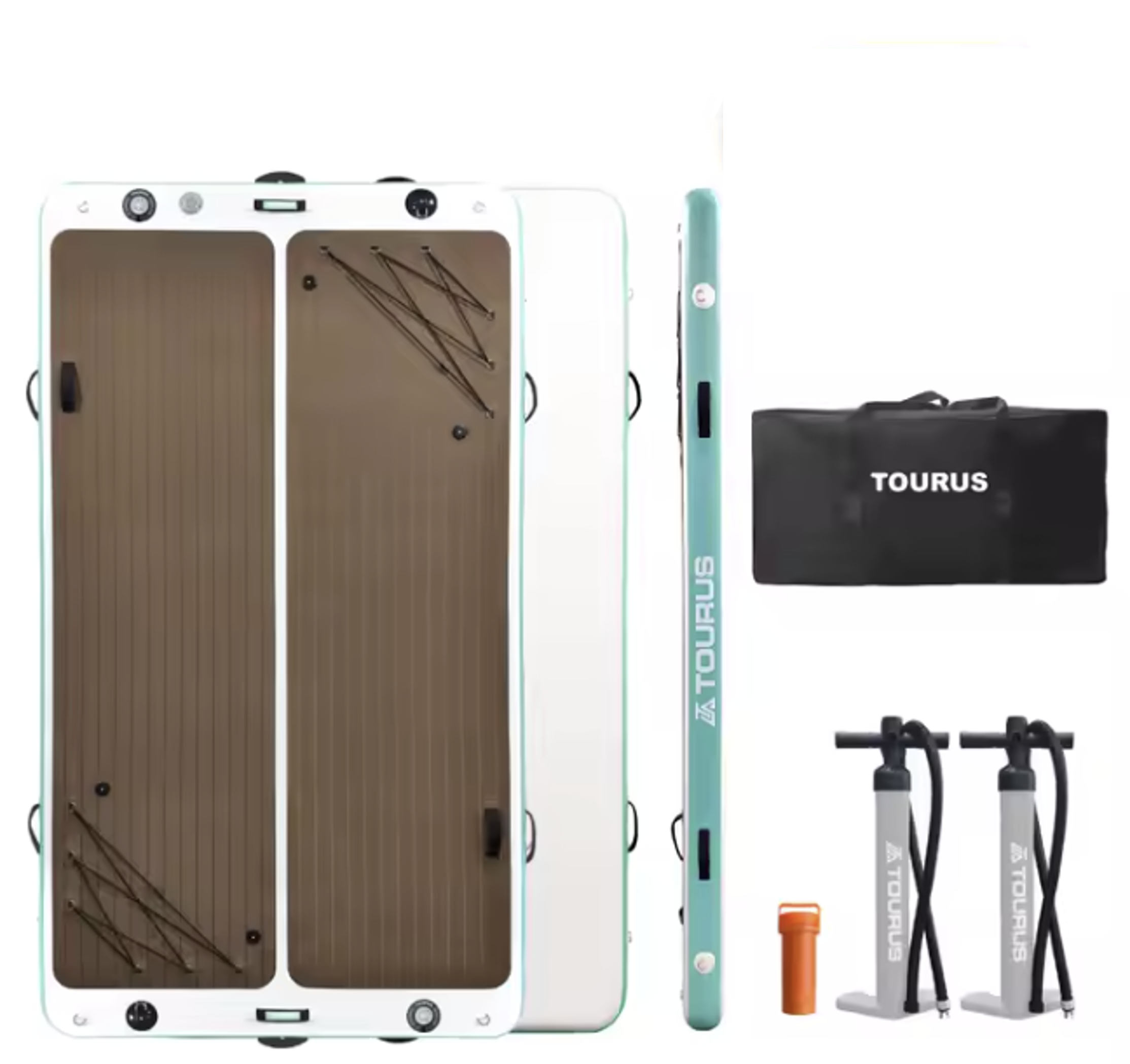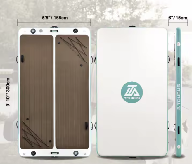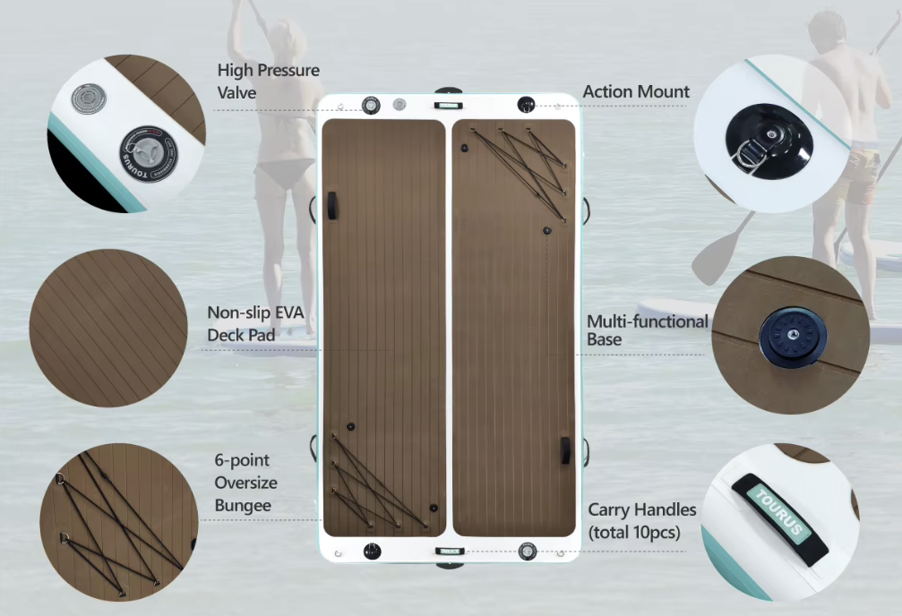 Disfruta del agua como nunca antes con la plataforma inflable Tourus: firme, amplia y fácil de instalar. Ideal para anclar tu paddle, relajarte bajo el sol, practicar yoga o convertirla en el punto de encuentro flotante con tus amigos.